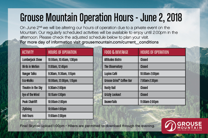 On Saturday, June 2nd Grouse Mountain is condensing its daily operations to accommodate a private function. So…June 2nd is the perfect day to make it an early start at Grouse Mountain!
