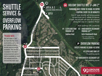 Over the 2016 Holiday period, there are times when parking at Grouse Mountain may become tight. To ease access to parking, Grouse Mountain is running a Holiday Shuttle from Cleveland Dam Parking lot on busy days.