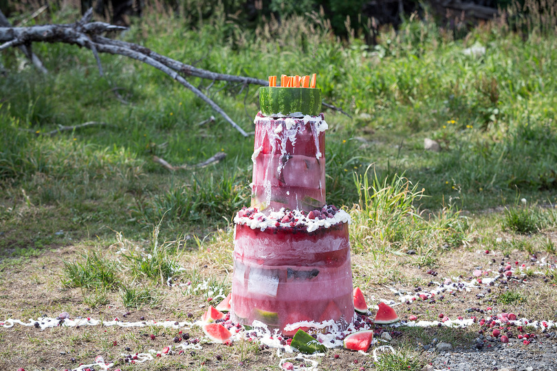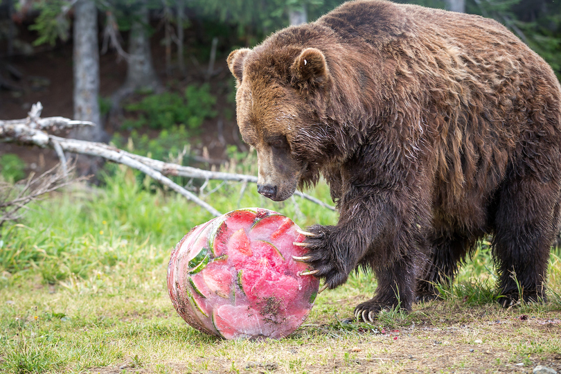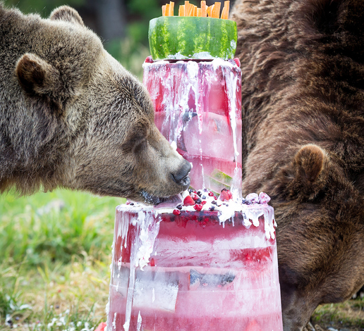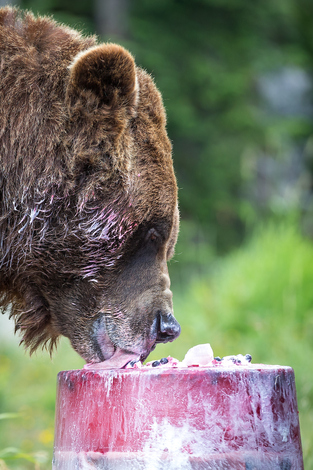 The highlight of the event was a gorgeous frozen Bear-thday cake that we gave to the bears to devour - it even included veterinarian approved whipping cream! When we let Grinder and Coola back into their upper pond habitat, they both quickly found the cake and started licking up the whip cream. Once the whip cream was largely gone, they started in on the ice layers which contained berries, nuts, fish and other tasty bear treats!