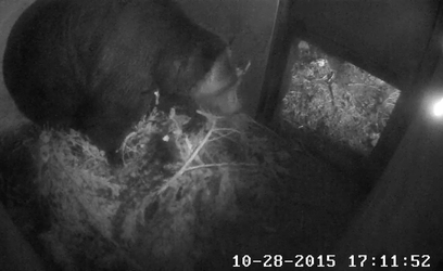 Last week, as temperatures dropped and days continue to get shorter, Grinder and Coola began to build their bed for winter 2015. We provided them with a large mound of Pacific Silver-Fir branches inside their bear 'hotel' and after ignoring them for quite a few days, the boys decided it was time to build a bed.
