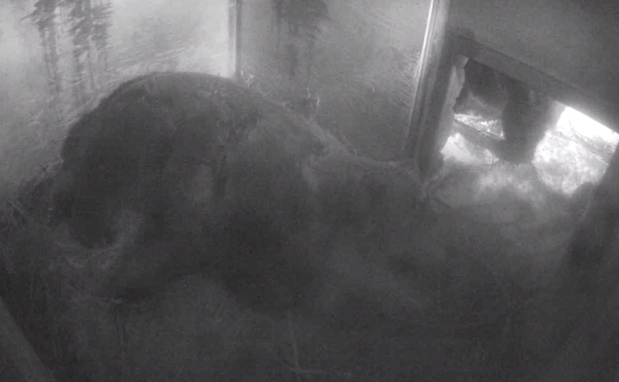 All of this motion is thought to keep their muscles, soft tissues and bones healthy during this period of non-activity. We've seen a lot of this on our cameras and occasionally catch Grinder and Coola out on one of their wanders. It definitely looks more like a sleep walk as the bears don't acknowledge us or even much in the den - just look around and then go back into their sleeping chamber.