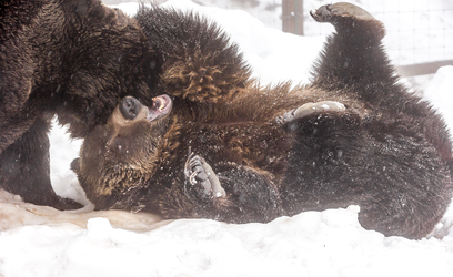 With personal hygiene off the list, it was time for a bit of play. Racing around their habitat, the bears took turns initiating short, playful, wrestling sessions. It seemed they wanted to wrestle longer but they are a bit out of shape after 5 months of mostly sleep! So for a break, they began to explore good places to dig their first snow caves of the year. We expect to see them develop over the next few days!