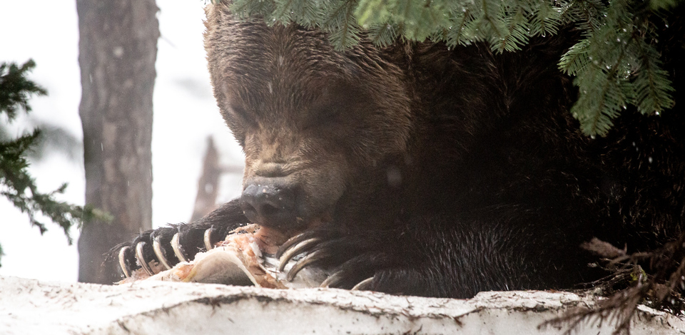 In addition to new territory, we hid a couple tasty salmon in the snow - a surprise snack and their first fish of the season. Bears are largely interested in leafy green vegetables when they first emerge from the hibernation den - these help flush out their digestive tract and get them metabolizing food again. After the first few weeks, bears will begin to incorporate some protein back into their diets but throughout the summer the balance will lean to more fruits and vegetables than meat.