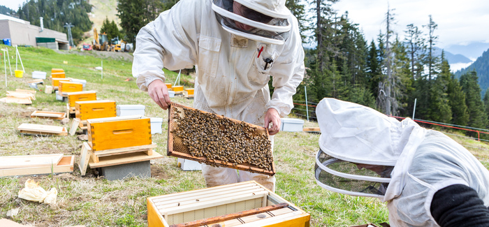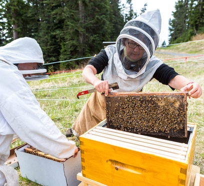 The bee yard can be viewed near the top of our Expo Ski-Run - mind the electric fence that is designed to keep our local black bears out of the hives and honey! (NOTE: 2017 - the bees have moved to the base area).
