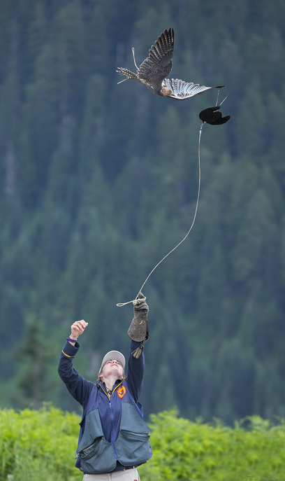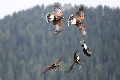 While the Harris' Hawks put on a great demonstration of concentration and maneuverability, the top aerodynamic abilities have to go to the falcons. Here is Trinity, a hybrid falcon, going after a lure in mid-air and upside down!
