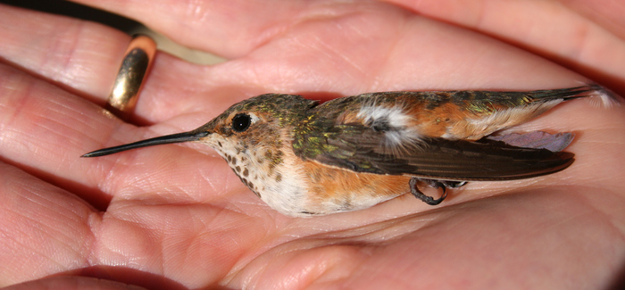 Yesterday we held our first hummingbird monitoring session of the year. According to our schedule, and the arrival of the birds in May, we were supposed to begin several weeks ago but the weather has not permitted us to safely band the birds. Tuesday, the weather held and our volunteers made it up and we ran a standard five hour monitoring session. Temperatures are still quite cold so we only banded two female Rufous Hummingbirds but that's a start!