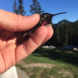 Normally we'd expect to get just a few hummingbirds in the early season, but because of a nice stretch of sunny weather we ended up catching, measuring, banding and releasing 15 hummingbirds of two different species. We banded 9 Rufous Hummingbirds and had three returning birds banded in previous years (2014, and 2015 in this case!). We were also thrilled to see three gorgeous adult Male Anna's Hummingbirds coming up from the coast to visit our feeders here on Grouse Mt.