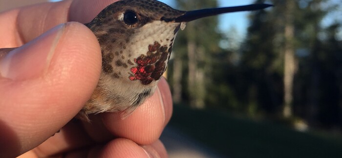 The project involves gently catching hummingbirds as they come to the feeder, taking some measurements, looking at the overall health of the birds, placing a very lightweight band on their leg (each band only weighs 5/100's of a gram!) and releasing the bird on its way.