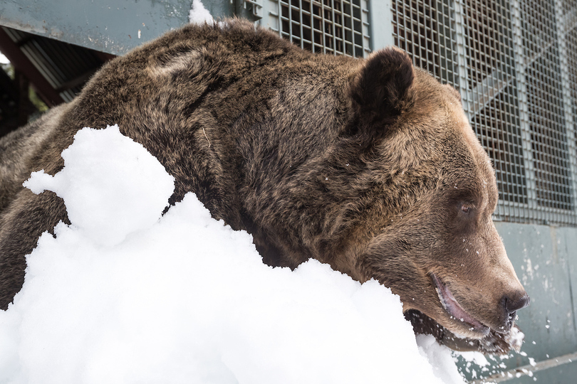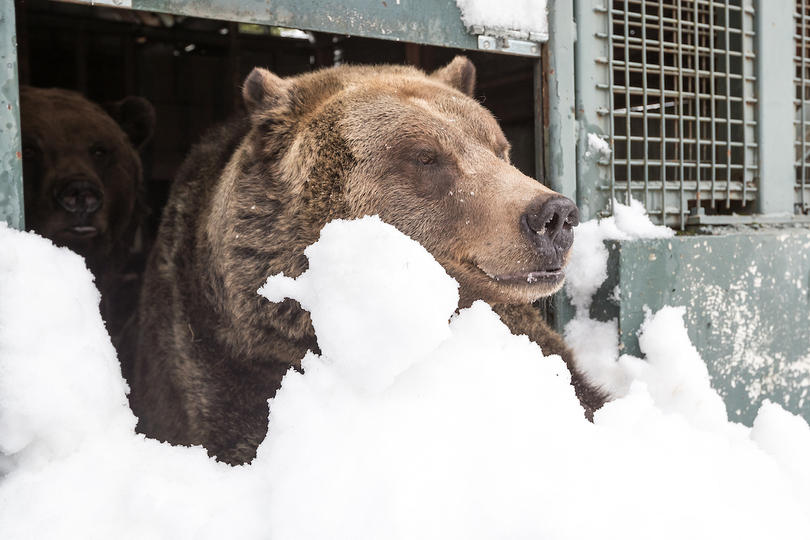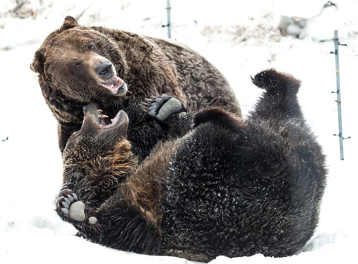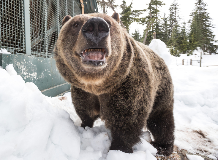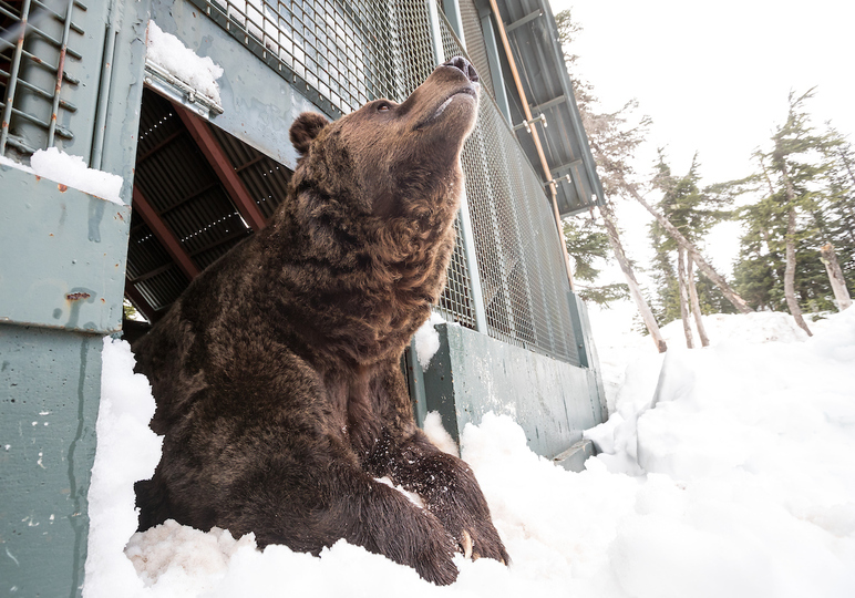 After a long 144 day hibernation, 19 year-old male grizzly bears Grinder and Coola emerged on April 21st from their slumber into a different world. Despite the lack of people present to greet them upon digging their way out of their den due to the temporary COVID-19 closure, the two massive Grizzlies were happy to frolic in the remaining snow and bathe in a small icy pond. A bit of wrestling and food gathering seemed to wear them out quickly as, after an hour or so, back they went to their den for a nap.
