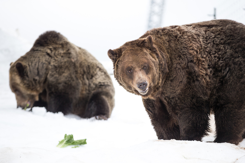 Typically, even though they have not eaten for almost 5 months, Grizzlies do not emerge from hibernation anxious to eat. It takes a while for their digestive system to kick start, and their preferred food items for the first few month are usually high in fiber. Grizzlies are omnivorous and up to 85% of their yearly diet is plant based. To replicate some of the food types Grizzlies would normally find at this time of year Grinder and Coola were first supplied with lettuce, carrots and sweet potatoes. Protein based foods are gradually introduced as the year progresses.