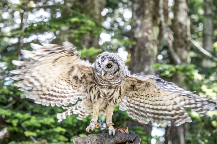 Barred Owls are a forest owl that can also nest in parks and urban areas. They are not typically shy around humans. Each year several Barred Owl chicks are raised at the Spotted Owl facility to help researches determine the best techniques for the rearing of the highly endangered Spotted Owls. Incubation times, hatching techniques, parenting methods are all important steps that the Barred Owls help us learn because of their close genetic relationship with the Spotted Owl. The Barred Owls as a species are very robust and have been expanding their range across North America in the last 100 years.