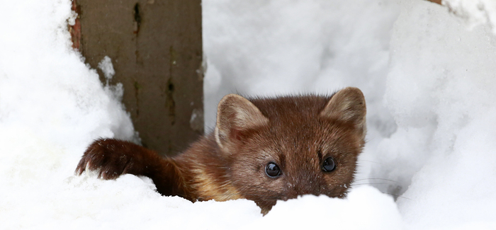 Pine Martens, Martes americana, are medium sized members of the weasel family, the Mustelidae. They have the long body typical of weasels, and long nosed faces with big ears. Overall they are pretty cute, but don't mistake good looks with friendliness - they also have the weasel's viciousness and lightening fast reflexes. They are omnivores who prefer meat such as mice, voles, birds and squirrels but will also eat berries, nuts and eggs.