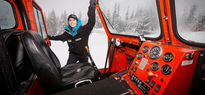 First up, meet Brittany. Still in her first season at Grouse Mountain she’s fit right into the team as one of our transport drivers. These transport vehicles are pretty unique to Grouse Mountain – normally used in hydro operations, we’re one of the very few ski resorts using this type of covered track vehicle. As a transport driver, Brittany’s been specially trained on vehicle operation and maintenance by our mechanics. On a regular day you’ll find Brittany helping out with morning setup, hauling supplies or moving people around the mountaintop in her little orange tank. “It’s a great job because I get to interact with so many different people – the team has become my mountain family. Plus, I have to admit, its fun driving around in the snow!”