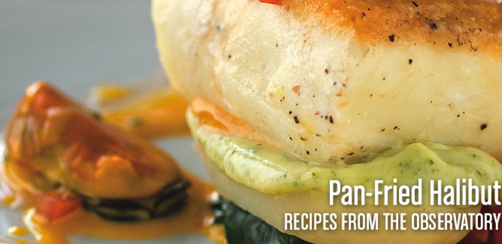 Recipes from The Observatory . Pan-Fried Halibuthoney mussels, saffron cream, new potatoes, and basil...