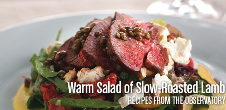 Recipes from The Observatory . Warm Salad of Slow-Roasted Lamb Ewe feta, sun dried tomato, roasted squash purée,...