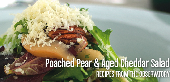 Recipes from The Observatory. Poached Bosc Pear and Aged Cheddar Salad winter greens, buttermilk cream, mapled...