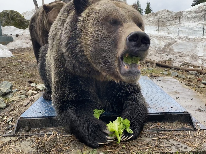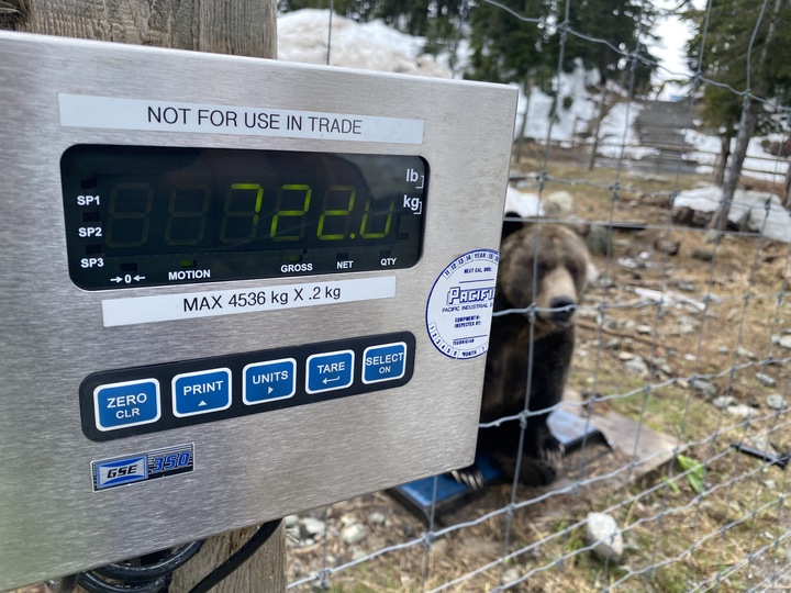 On the day they emerged both bears were too excited to sit still on our weigh scale but since then we have started their daily routine of sitting for wildlife staff to record their weight. Grinder went into hibernation in November at 921 pounds and Coola weighed 1056 pounds and shortly after emerging their weights were recorded as 727 pounds for Grinder and 850 pounds for Coola! This represents about a 200 pound drop, or about 20% of their body weight, for both bears over the nearly five months that they were in hibernation. This is about the average we see each year.