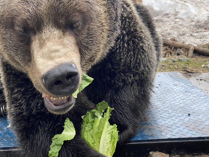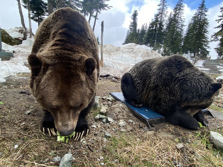Both bears are still sleeping inside the den each evening but spend their days outside watching as spring develops here on Grouse Mountain. The bears are not as hungry as you might think as their digestive tracks have been in shut down mode during their winter sleep. Each day they are receiving several large heads of Romaine lettuce in addition to root vegetables such as carrots and sweet potatoes. This roughage helps clean out their digestive tracks and gets their metabolism up and running again after being shut down for so long. As their activity ramps up we adjust their feeding schedule to keep up.