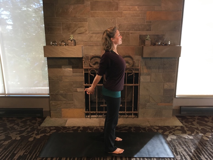 • Gently press palms down and slightly away as you reach shoulder blades toward one another and open chest.